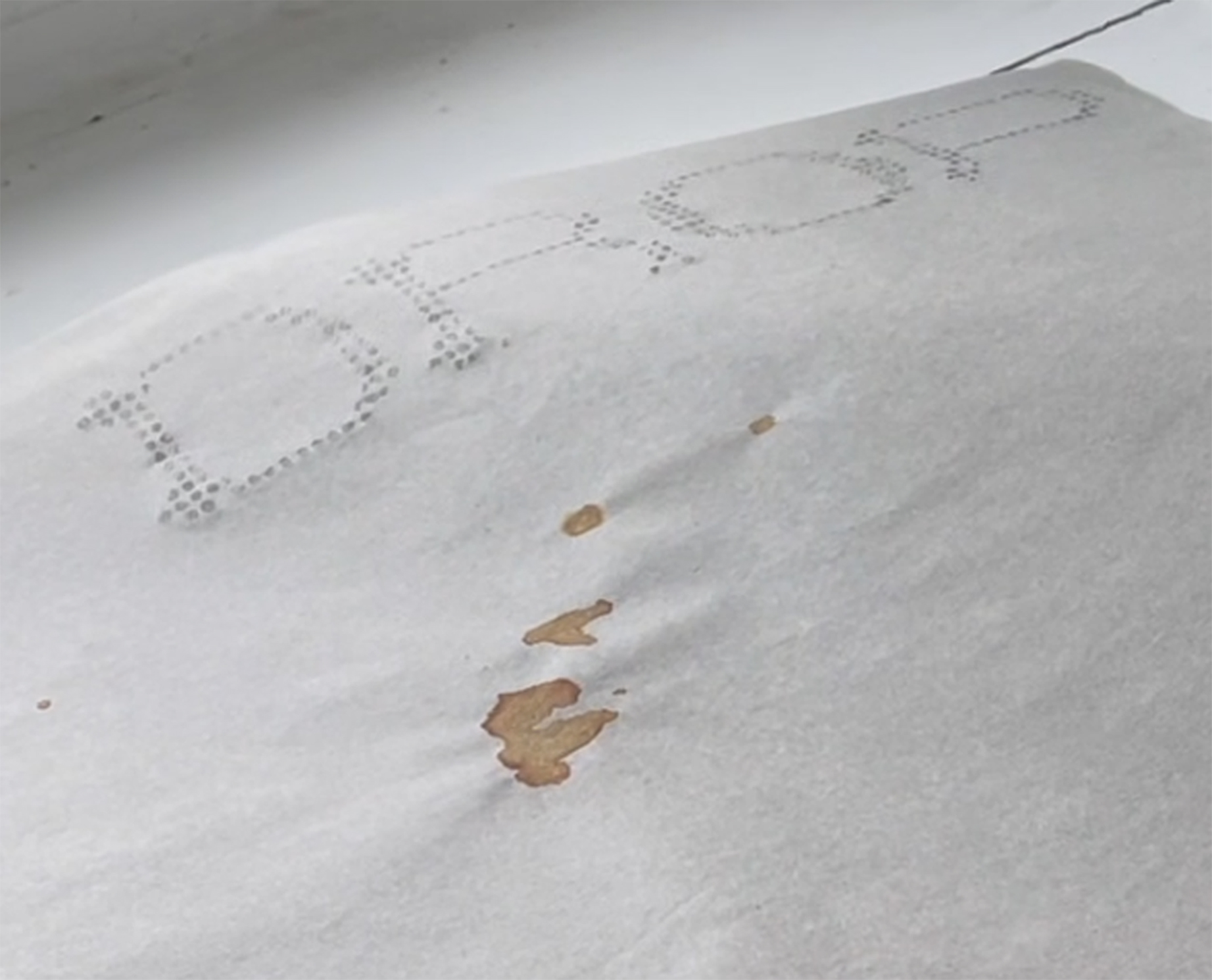 ‘Pietà’ – iodine and baby oil on newsprint paper. Just as a memorialised story is a form of fiction so too is one that is demonised. This work reflects on local events that became headline news in the early 1990’s. Despite being such an extremely tragic story, it seemed important to acknowledge it in some way, however subtly. The work is a contemplation on the fiction of separateness and apparent tragedy that can occur around those who experience it as real.
