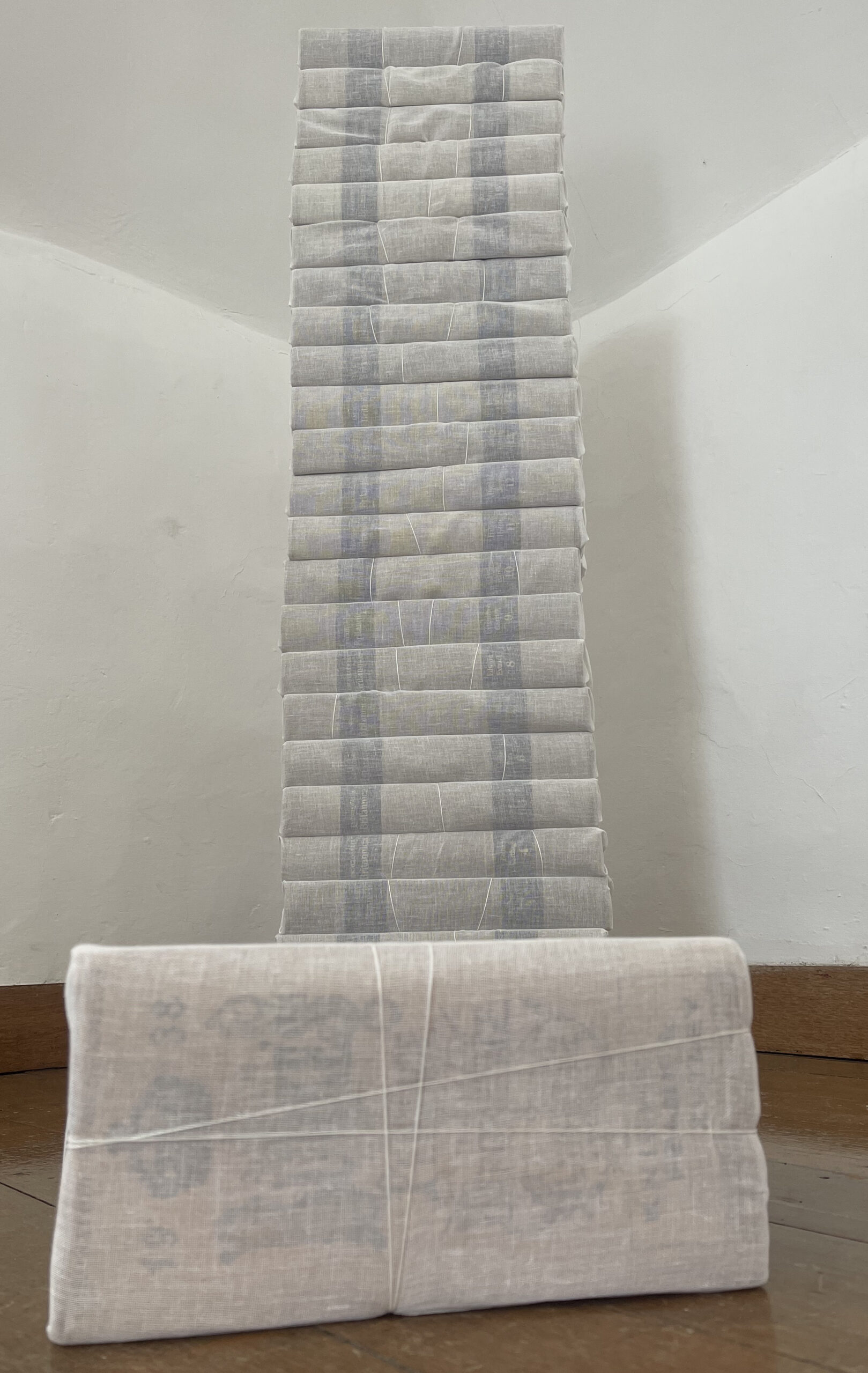 ‘Pillars’, 18thC Bible; 23 volumes of Encyclopaedia Britannica and Burke’s Peerage 1938, wrapped in bookbinding cloth and tied with whipping twine. (Books loaned from the Willoughby Memorial Library). This work was a response to the notion of boundaries, conceived and upheld by the church, the state and conventional education – parameters formed to contain what is considered acceptable and reject what is not – props to ‘know your place’.