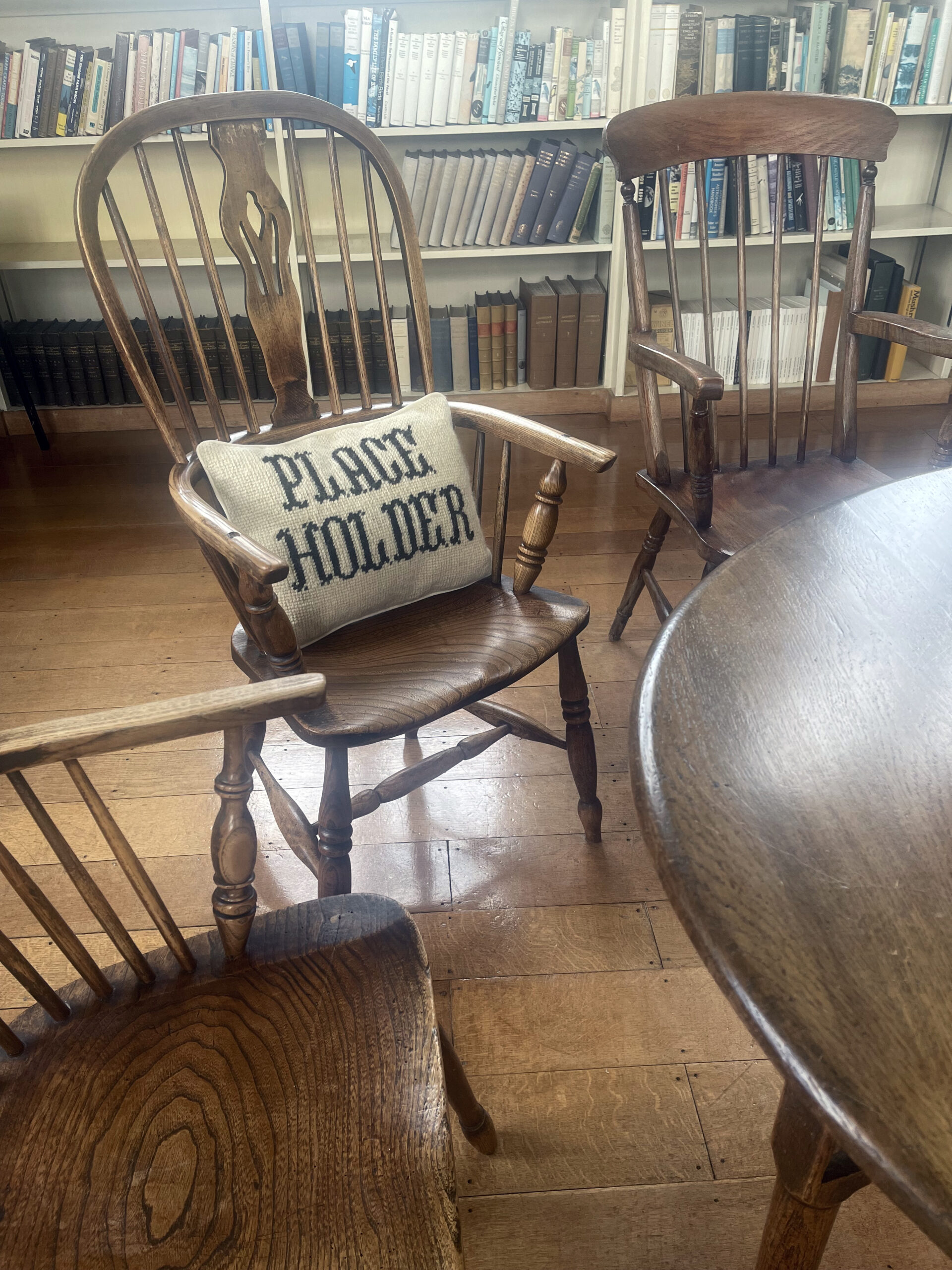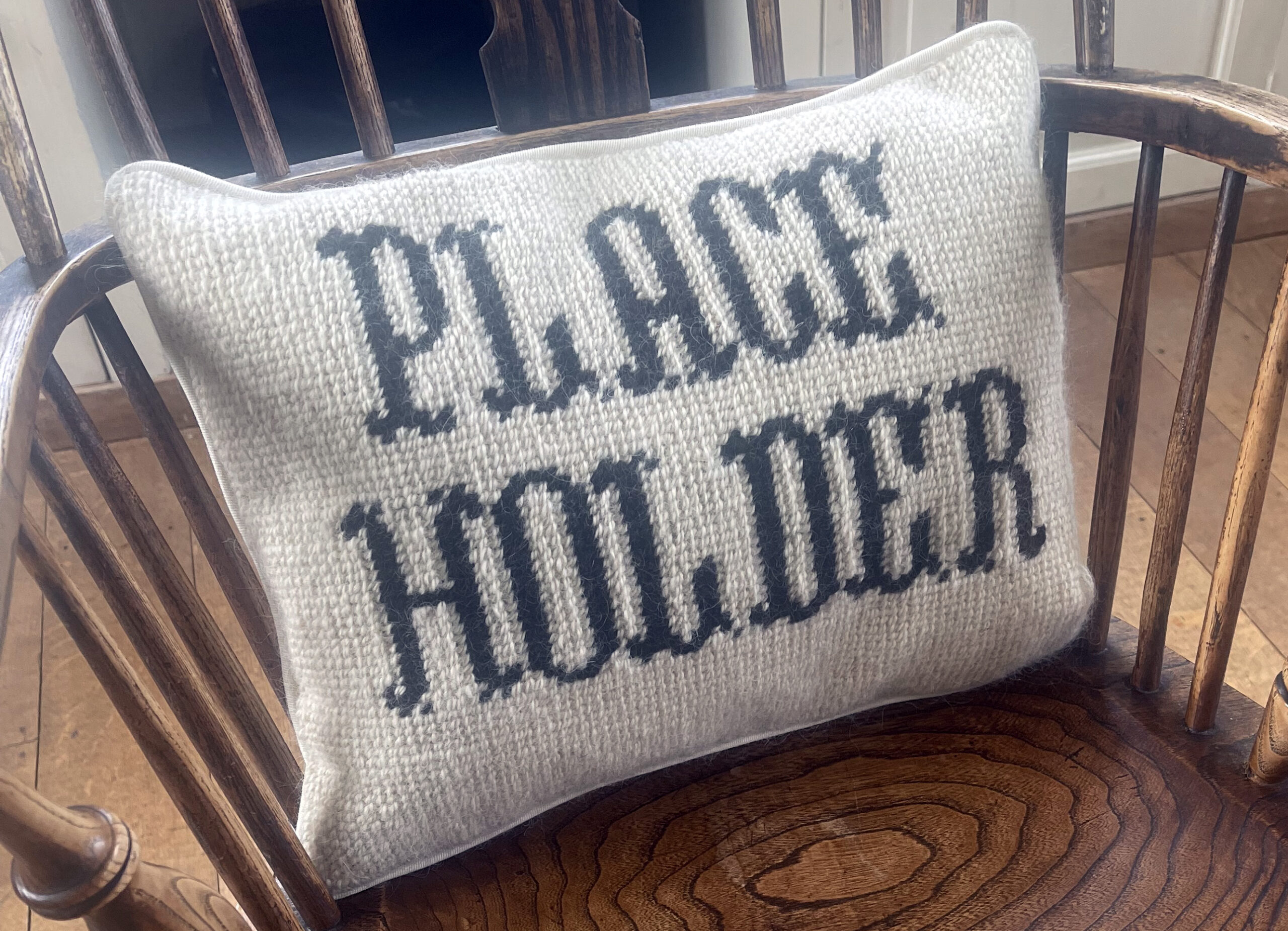 ‘Placeholder’, undyed Lincoln Longwool and Jacob Lambswool needlepoint cushion, on a 18th C Lincolnshire Windsor chair next to the memorial to Lord Timothy Willoughby de Eresby. The memorialised story of Timothy’s death suggests that, age 27, he was shipwrecked in the Mediterranean and died at sea, however rumours hint that he may have willingly disappeared owing to his impending Earlship and the fact that his sexuality was a criminal offence at the time. The work simply holds a place for those whose stories are ‘out of place’ somehow.